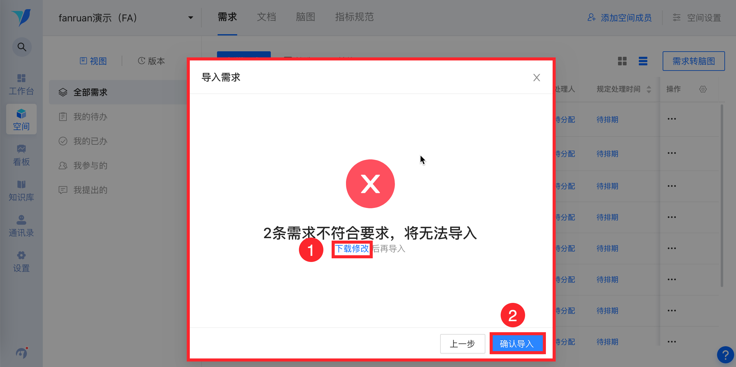 若全部导入失败,会显示“X条需求不符合要求,将无法导入”,点击【下载修改】,再点击【确认导入】,再修改刚刚下载的不符合要求的需求按步骤重新上传