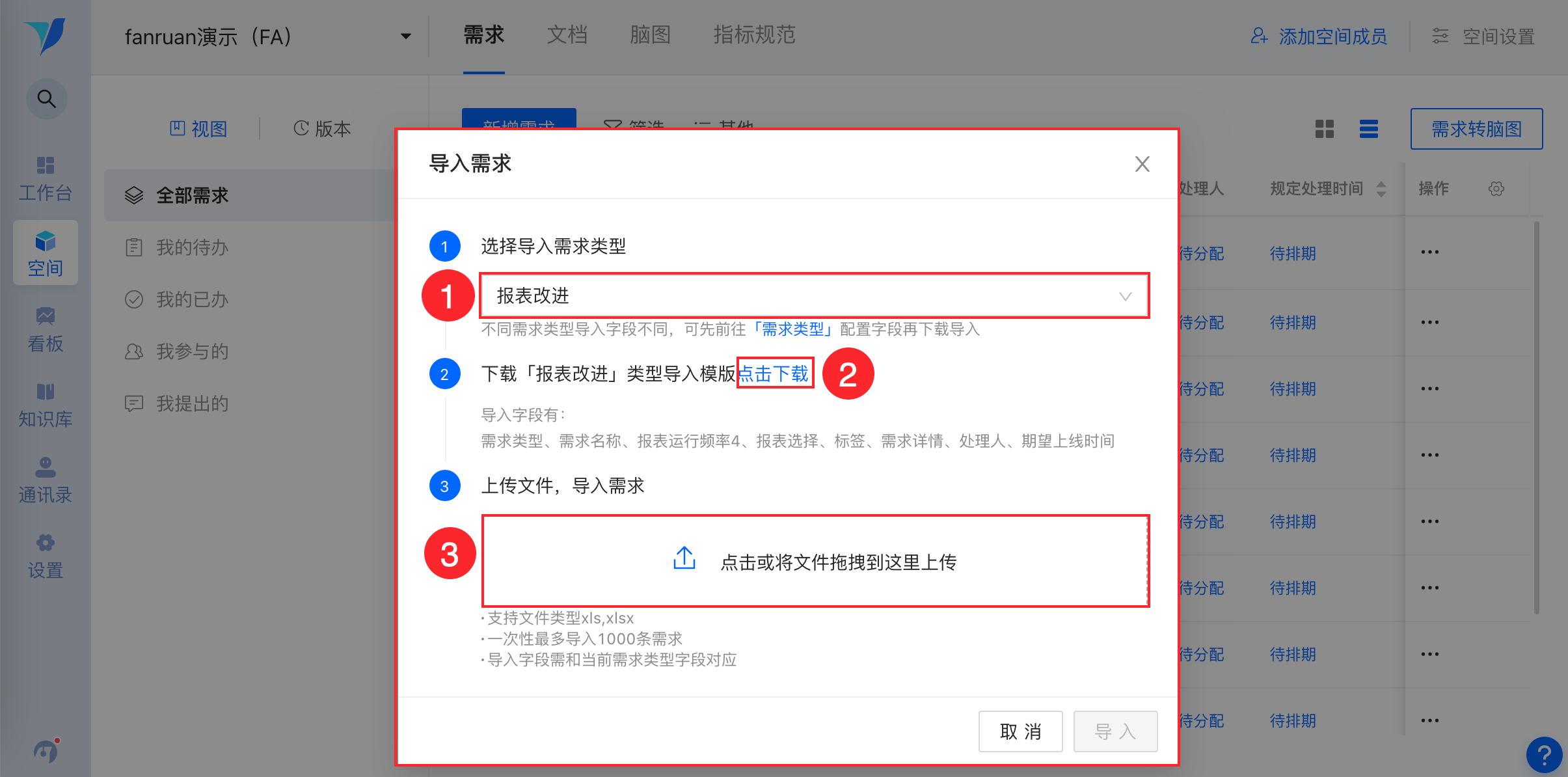 然后,根据提示选择【需求类型】,【点击下载】模版,根据字段提示将模版填写好重新上传,选择【导入】