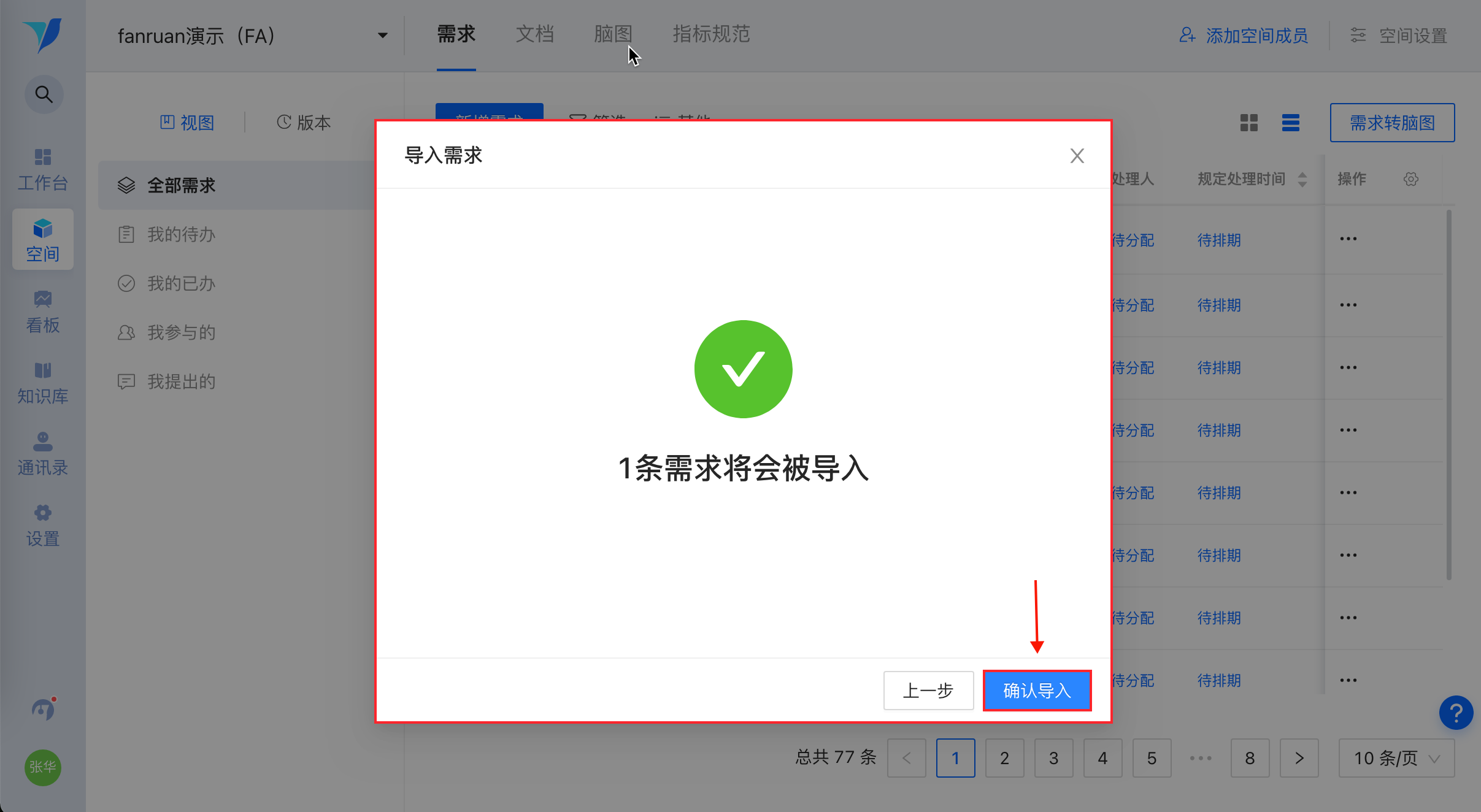 若全部成功导入,则显示“X条需求将会被导入”,点击【确认导入】