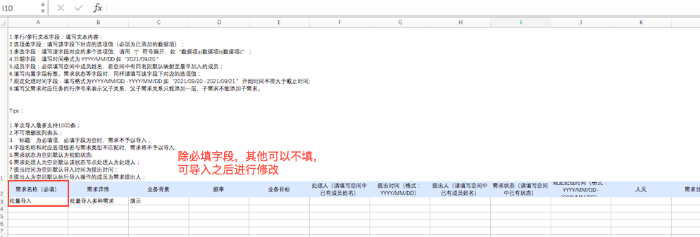 注:不同的需求类型配置的字段不一样,选择不同的需求类型,即可下载不同类型的模版,从而导入这种类型的需求