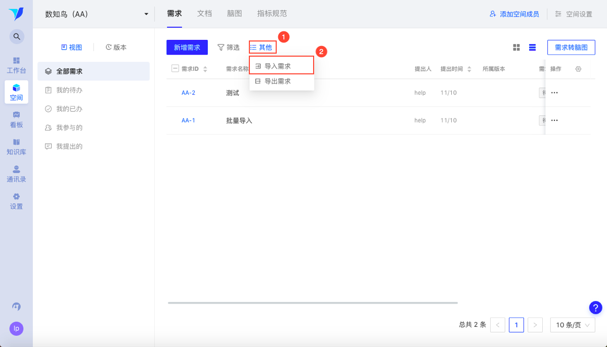 注:【导入需求】功能只有空间管理员可以操作!设置空间管理员权限可参见文档:空间成员管理与分享管理