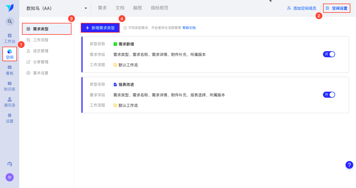 【空间设置】->>【需求类型】->>【新增需求类型】
