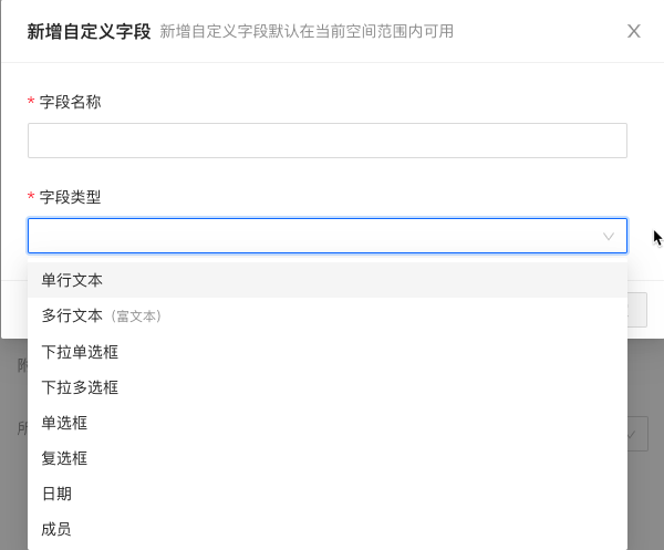 【自定义字段 +】->>填写【字段名称】->>【选择字段类型】