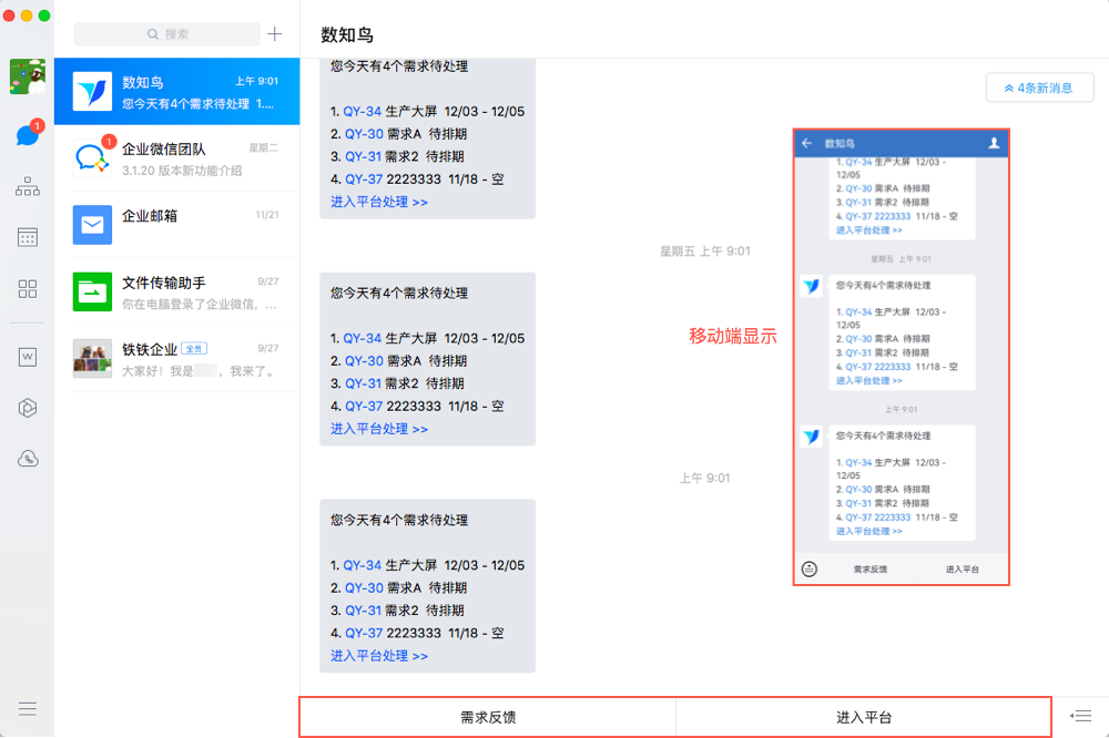 1、企业微信内可以快捷进行需求反馈、单点登录平台