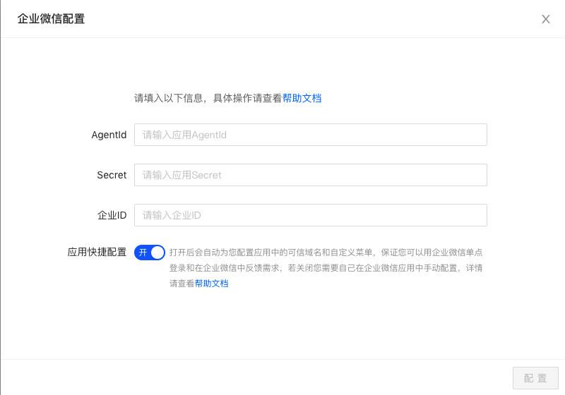 点击启用企业微信用户体系后,出现以下页面,页面中的字段需要在企业微信后台获取: