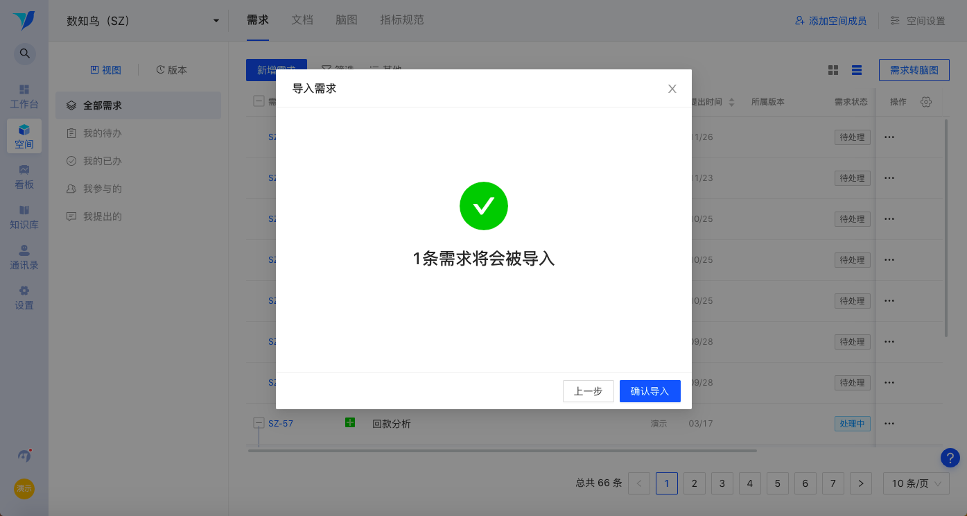 若全部成功导入,则显示“X条需求将会被导入”,点击【确认导入】