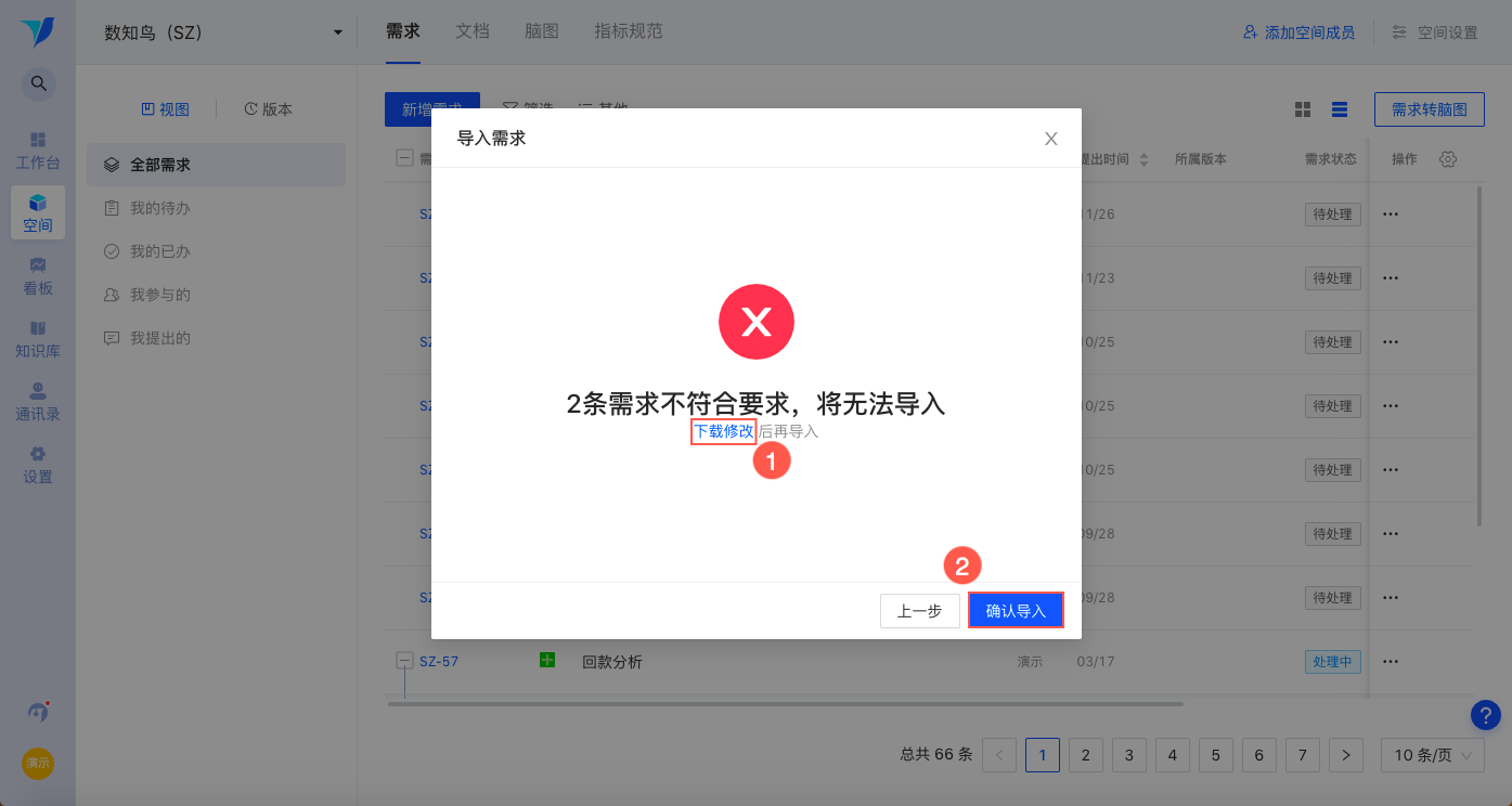 若全部导入失败,会显示“X条需求不符合要求,将无法导入”,点击【下载修改】,再点击【确认导入】