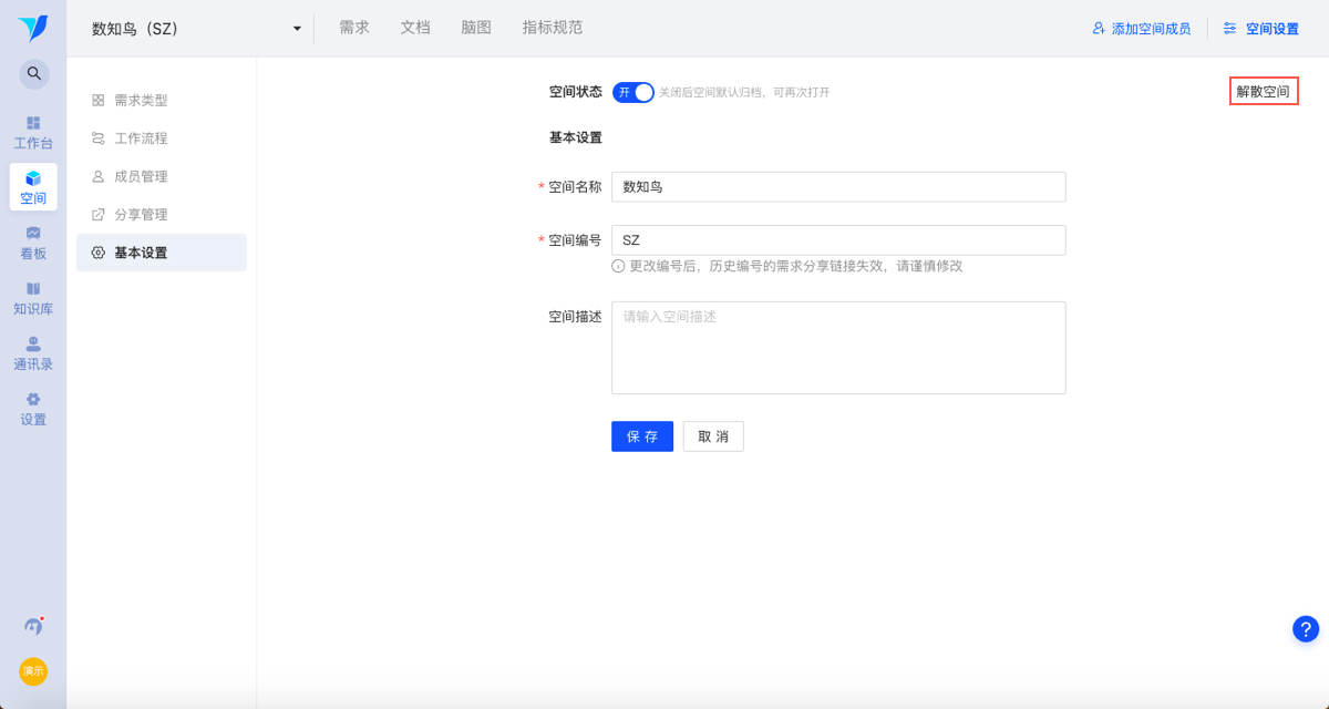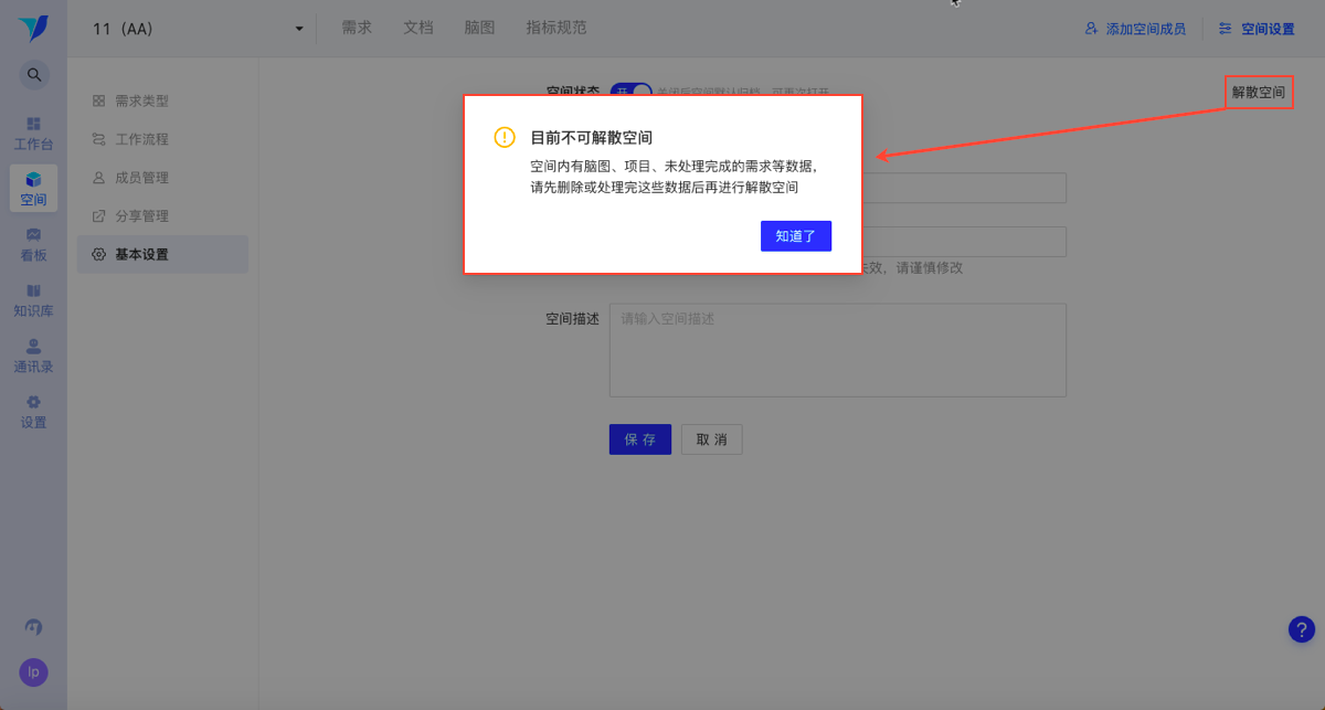 当空间内有脑图、项目、未处理完成的需求等数据,不可解散空间