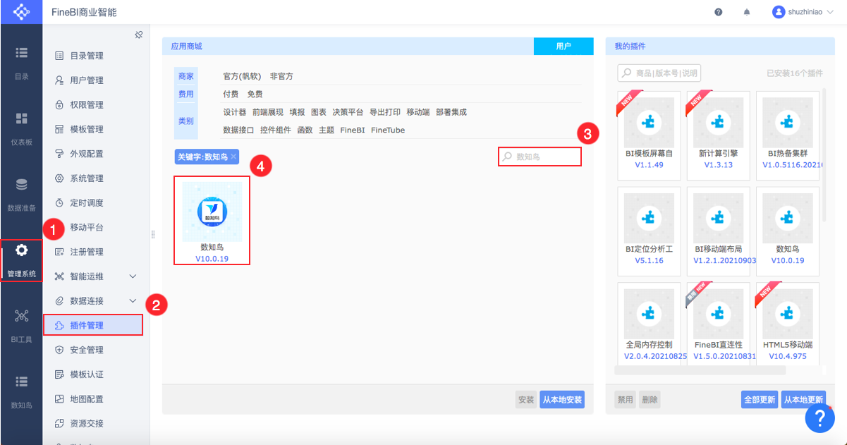 以FineReport/FineBI超级管理员【admin】的身份,登录决策平台,在插件商城找到并安装“数知鸟”插件。