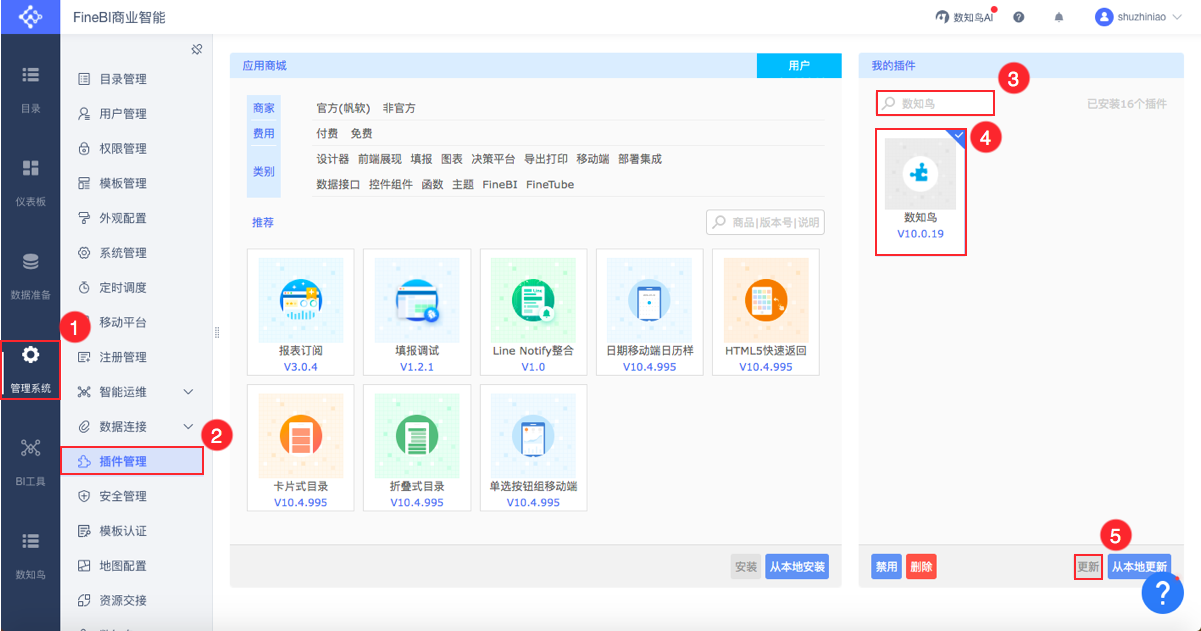 【管理系统】->>【插件管理】->>【我的插件】->>选中“数知鸟”->>【更新】