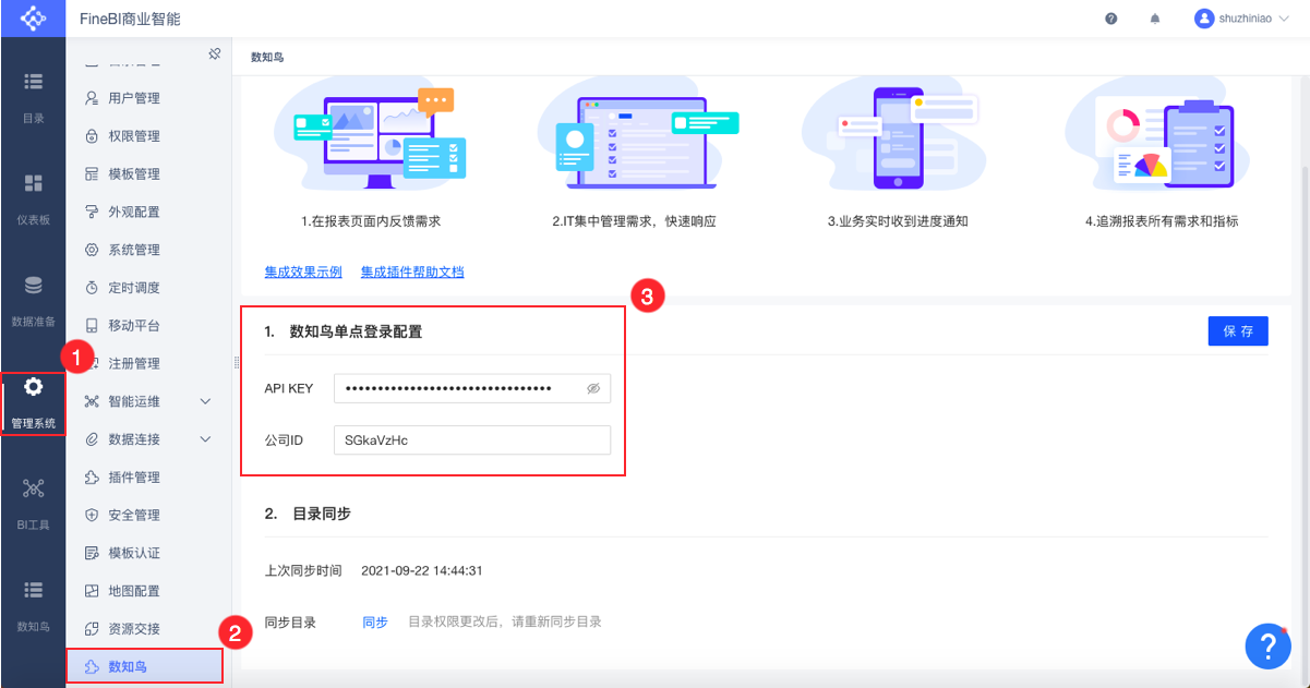 【管理系统】->>【数知鸟】->>填写【数知鸟单点登录配置】