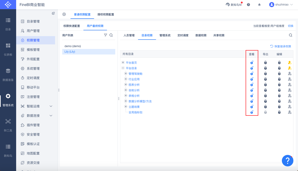 【普通权限配置】->>【用户最终权限】->>选定用户->>【管理系统】->>打开数知鸟后的那把锁