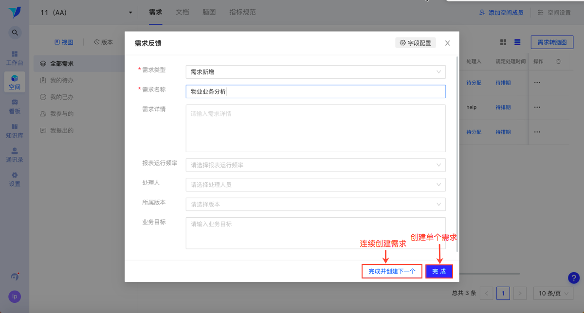 在【空间】内点击【新增需求】即可进行需求反馈,需求类型需要提前进行设定
