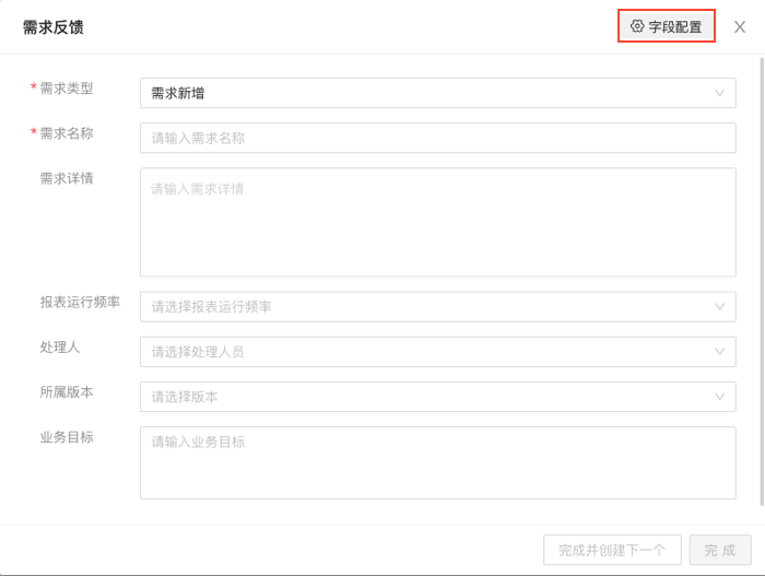 若管理员选定【需求新增】类型,需要调整自定义字段,则需点击【需求反馈】右上角的【字段配置】