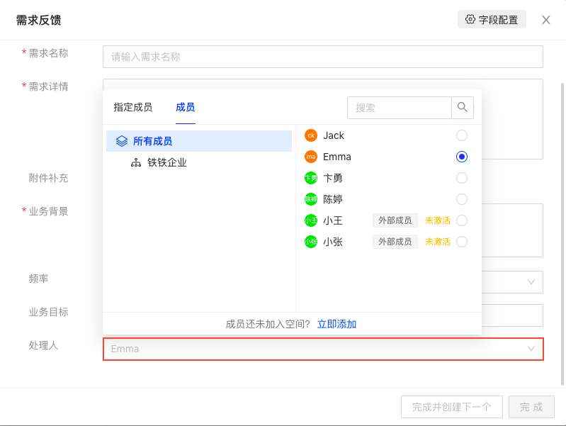 注:需求反馈时显示的字段提示可由企业管理员自定义,具体操作点击跳转