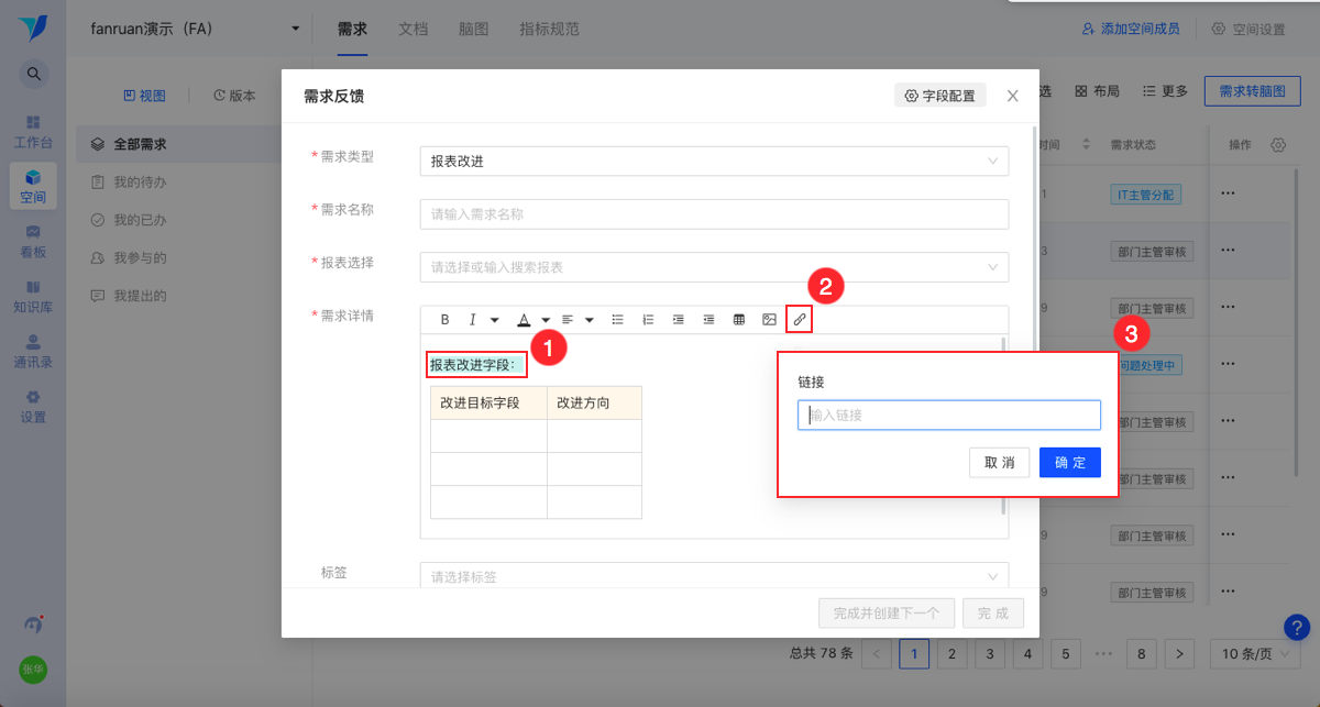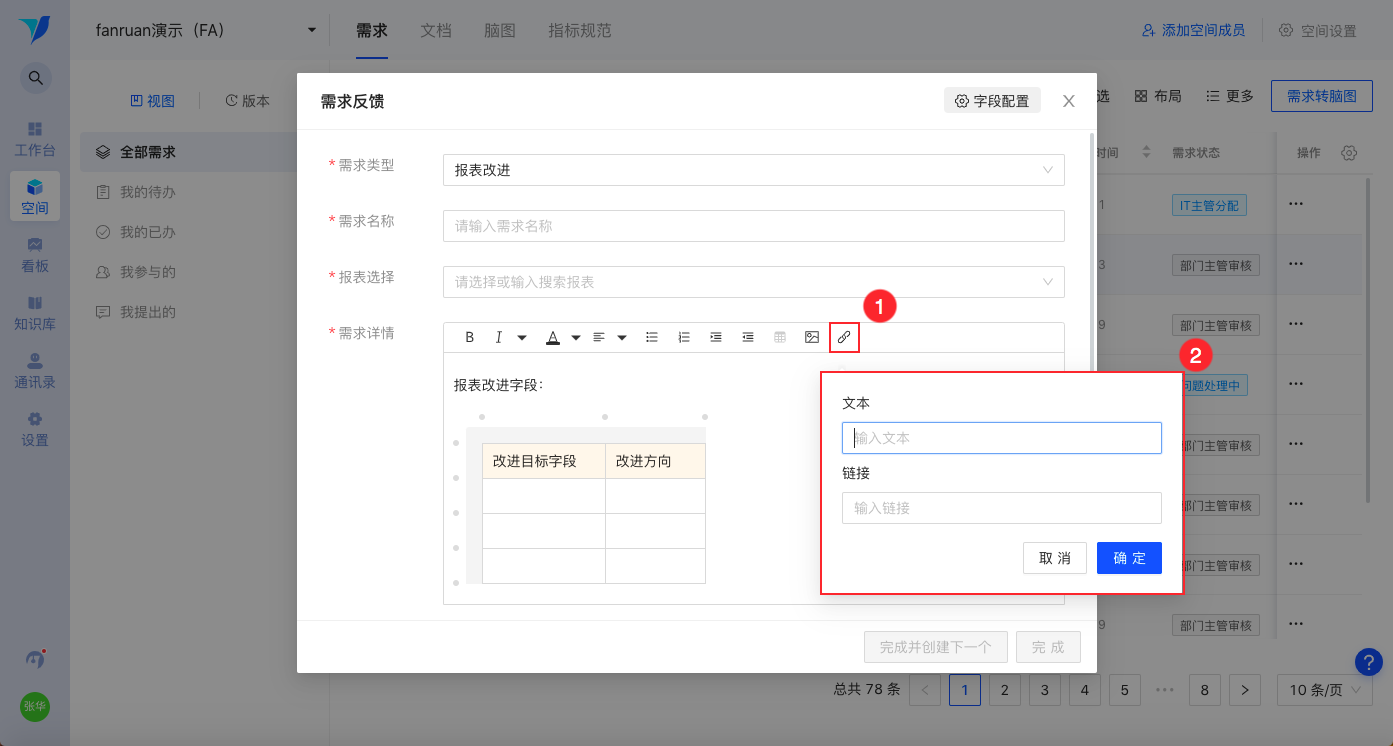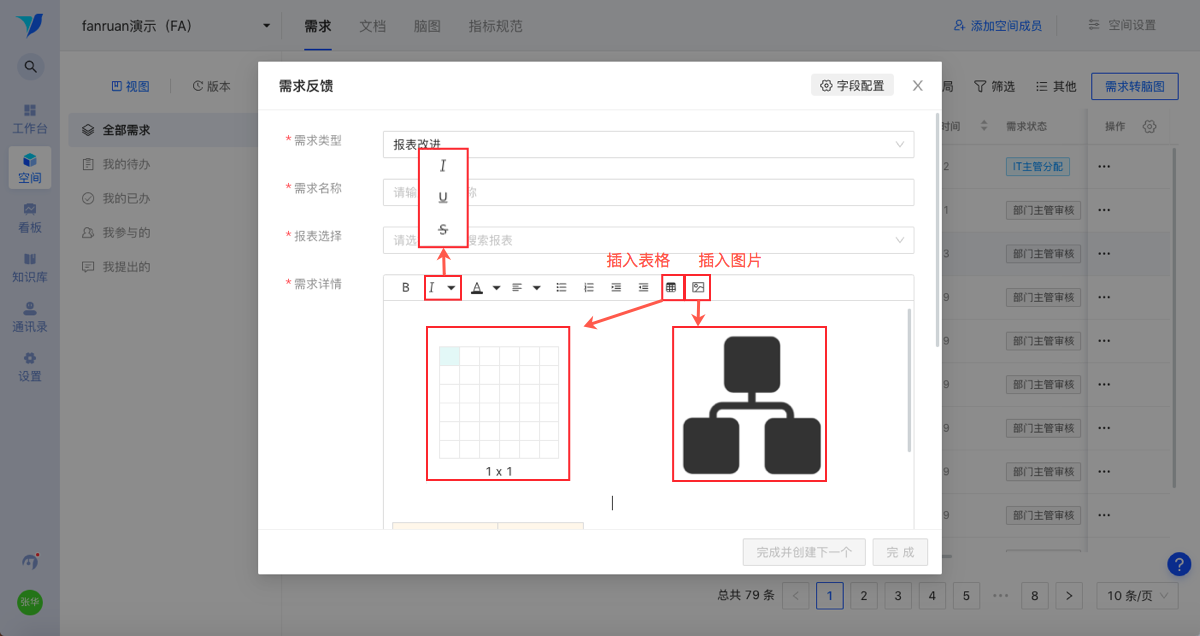 需求反馈时可在【需求详情】等富文本字段即时插入表格、图片