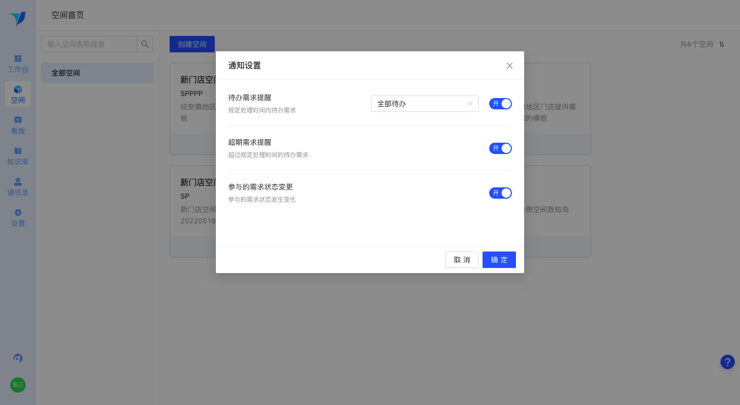 该功能可针对「待办需求提醒」、「超期需求提醒」、「参与的需求状态变更」这三类通知进行个性化设置是否推送,以满足日常工作中用户提交了需求后,不需要继续跟进待处理的情况。