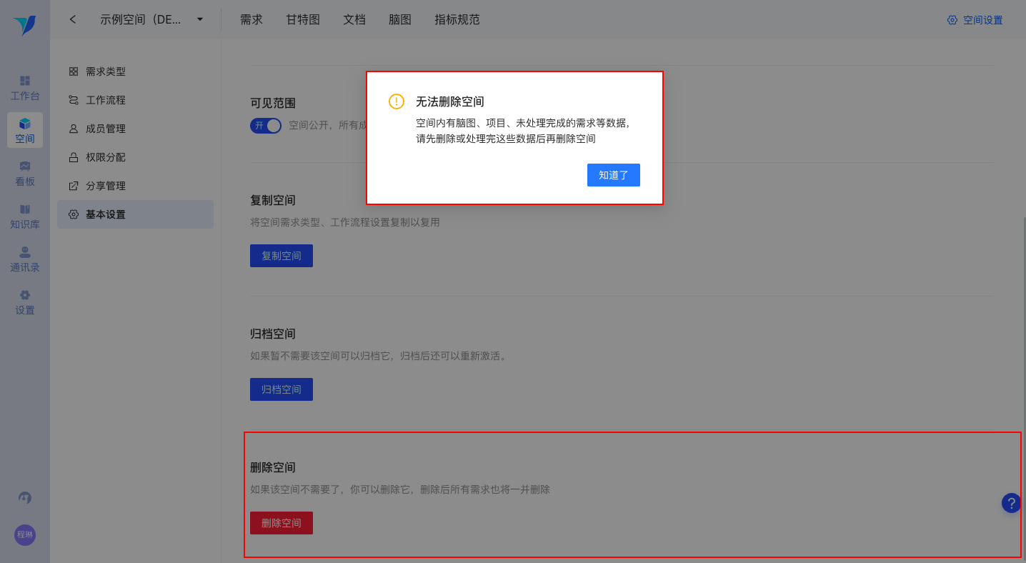 该功能可以将被复制空间的「需求类型」、「工作流程」、「成员管理」及「权限分配」复制到新空间,以满足日常工作中,用户在已设置好一个完备空间的情况下,需要设置若干相同条件的空间时的场景。具体可点击帮助文档进行查看。