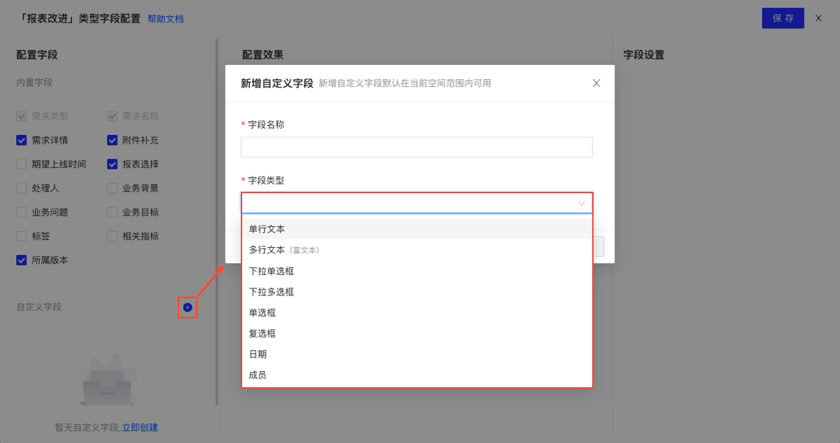 2)自定义字段平台提供包括字段、选框、日期、成员、数值等九种字段类型,可以按需自定义需求反馈字段