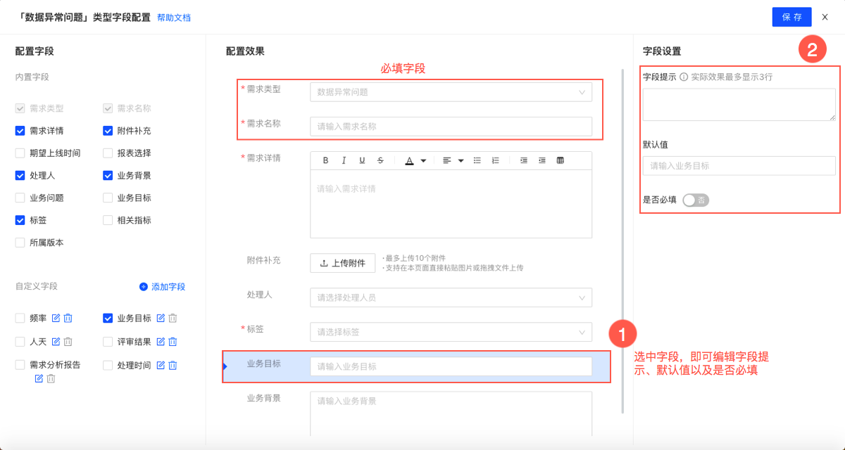 新建成功后,自动跳转【配置字段】,编辑需求的反馈字段