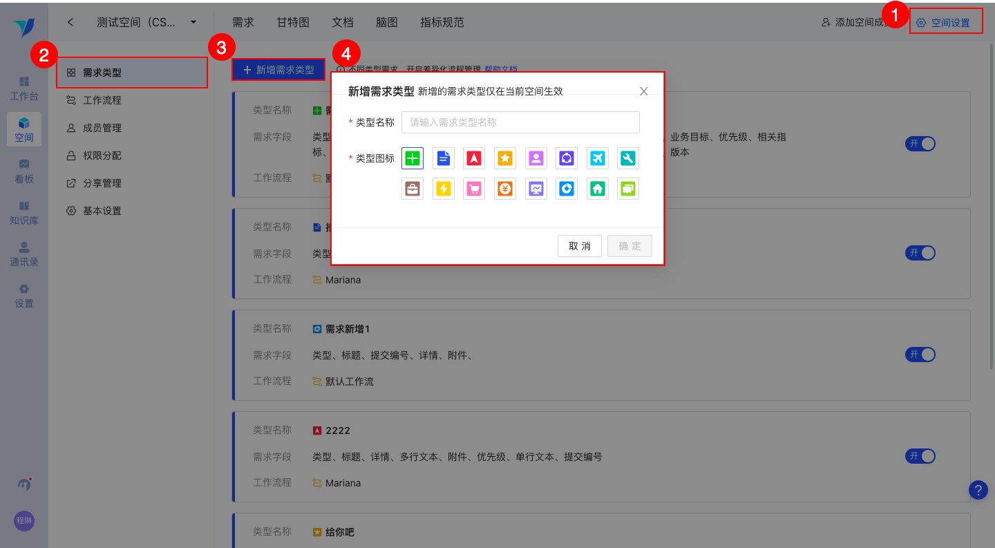 在「空间设置」中「新增需求类型」,按照实际情况设置自定义的个性化需求类型,输入需求的名称,比如:技术需求、客户需求、新增报表需求等,并选择需求类型的图标。
