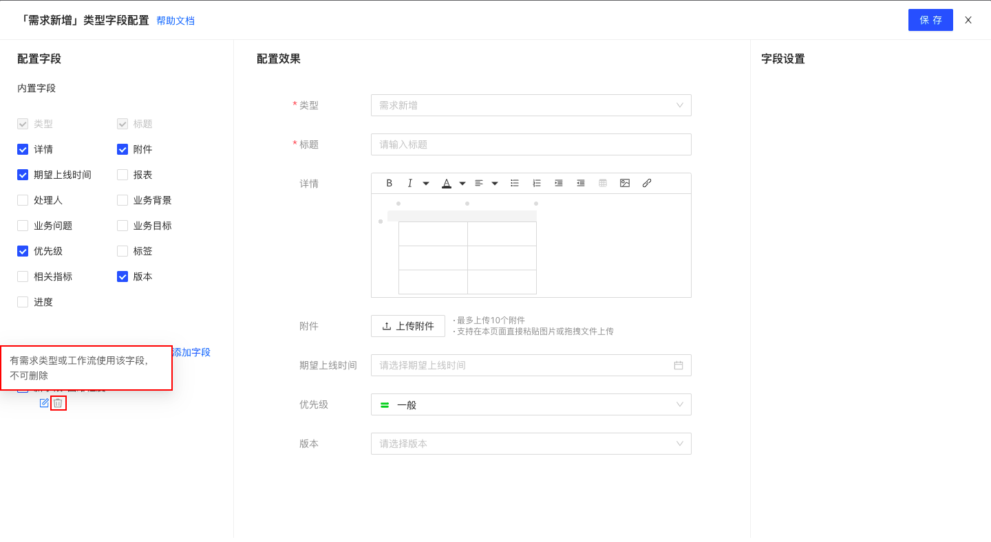 自定义字段也可以,确保没有需求类型在使用该字段时,就可以删除该字段,避免字段冗余。注:有需求类型使用该字段时,不可删除