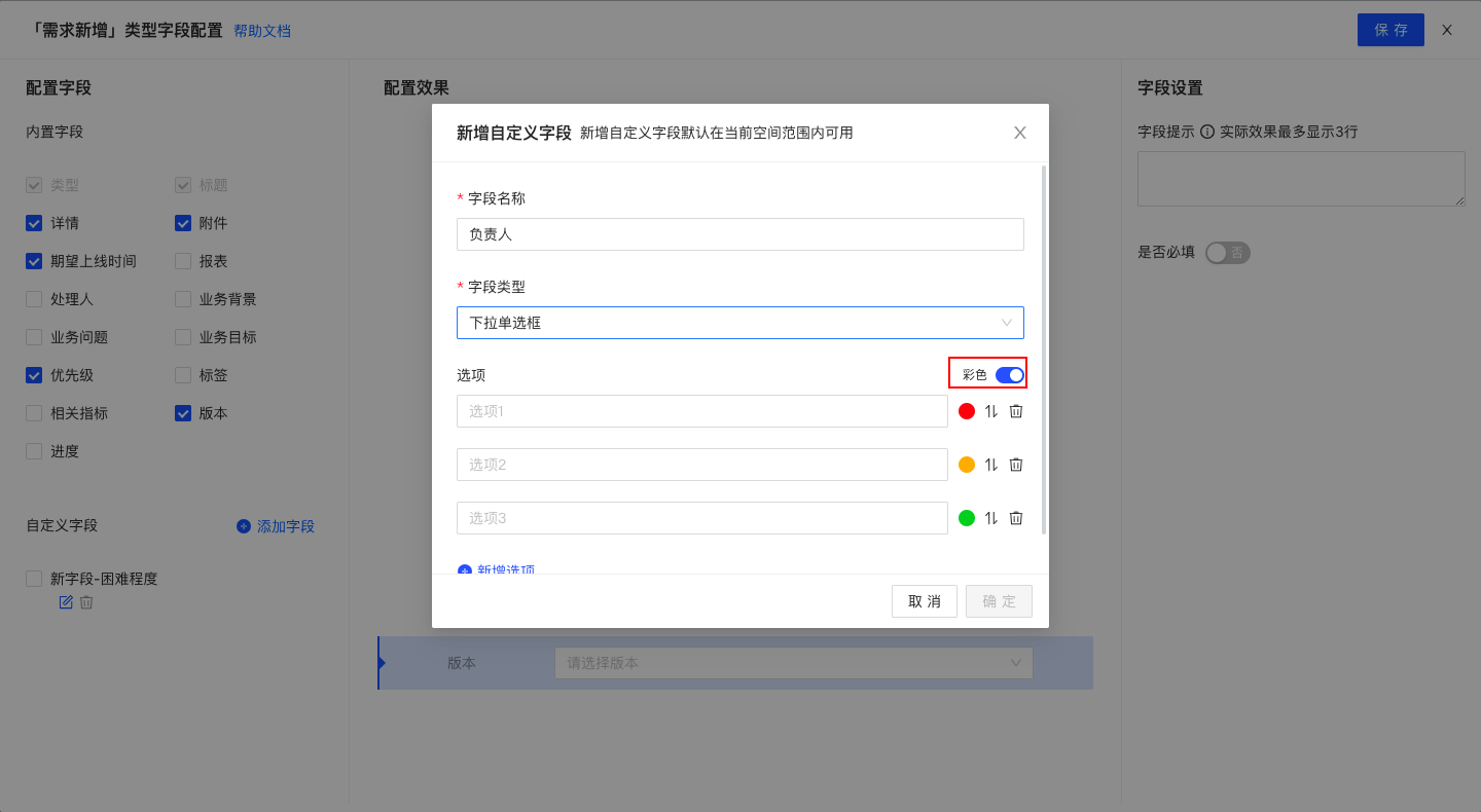 自定义可以进行字段样式优化,可以对下拉单选框、下拉多选框、复选框、单选框这四种字段类型进行色彩设置。开启彩色后,可标签化管理字段信息,更好区分信息优先级,方便管理需求。