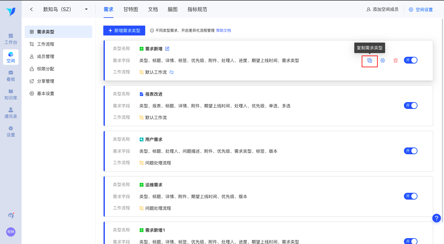 有的需求类型字段会差不多,但又在细微处有少许不同。可以点击复制创建新的需求类型,在原有基础上进行小部分改动即可生成适合的新需求类型。
