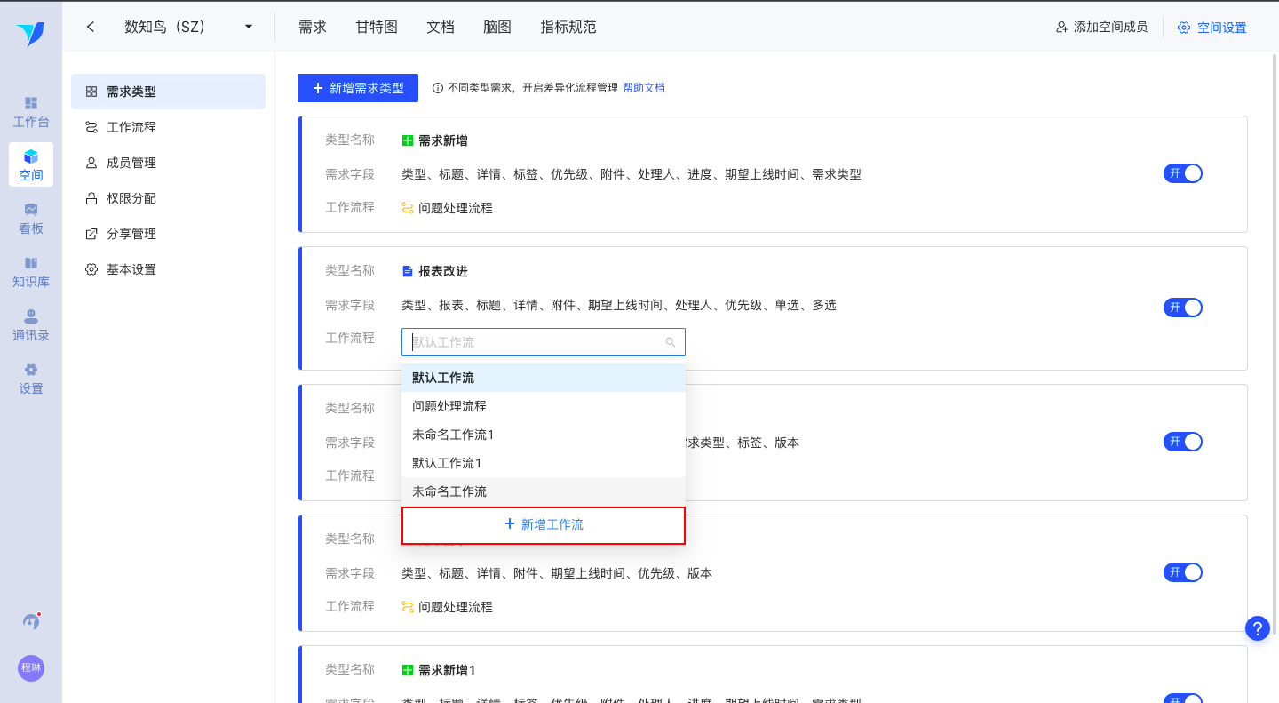 若需新建工作流程,也可在「空间设置」中的「工作流程」中直接新增。