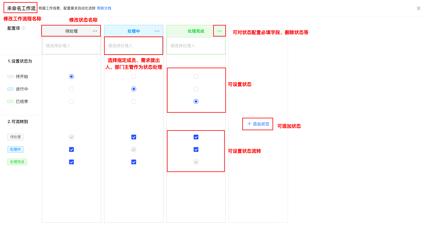 在新增页面填写相应的流程名称,设置所需处理状态、选择对应的状态处理人,并设置流转路径,查看详细操作步骤