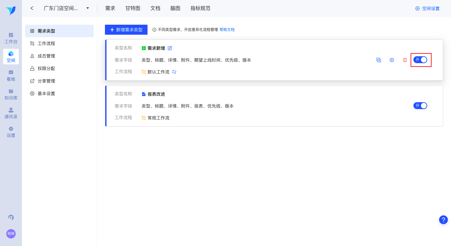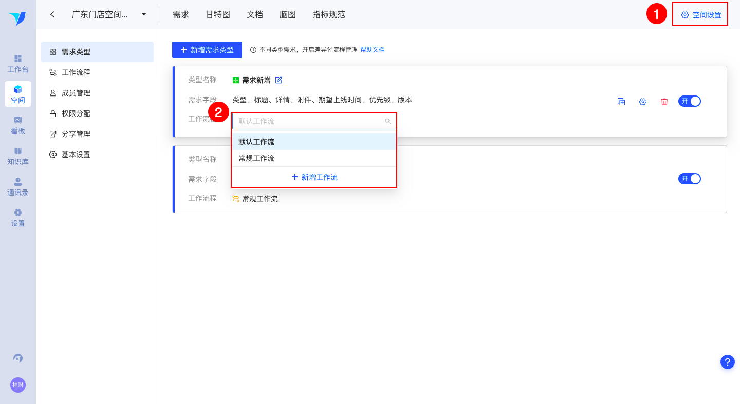 注:仅空间拥有者和拥有需求类型的空间成员可以新增需求类型。权限设置可点击帮助文档进行查看。