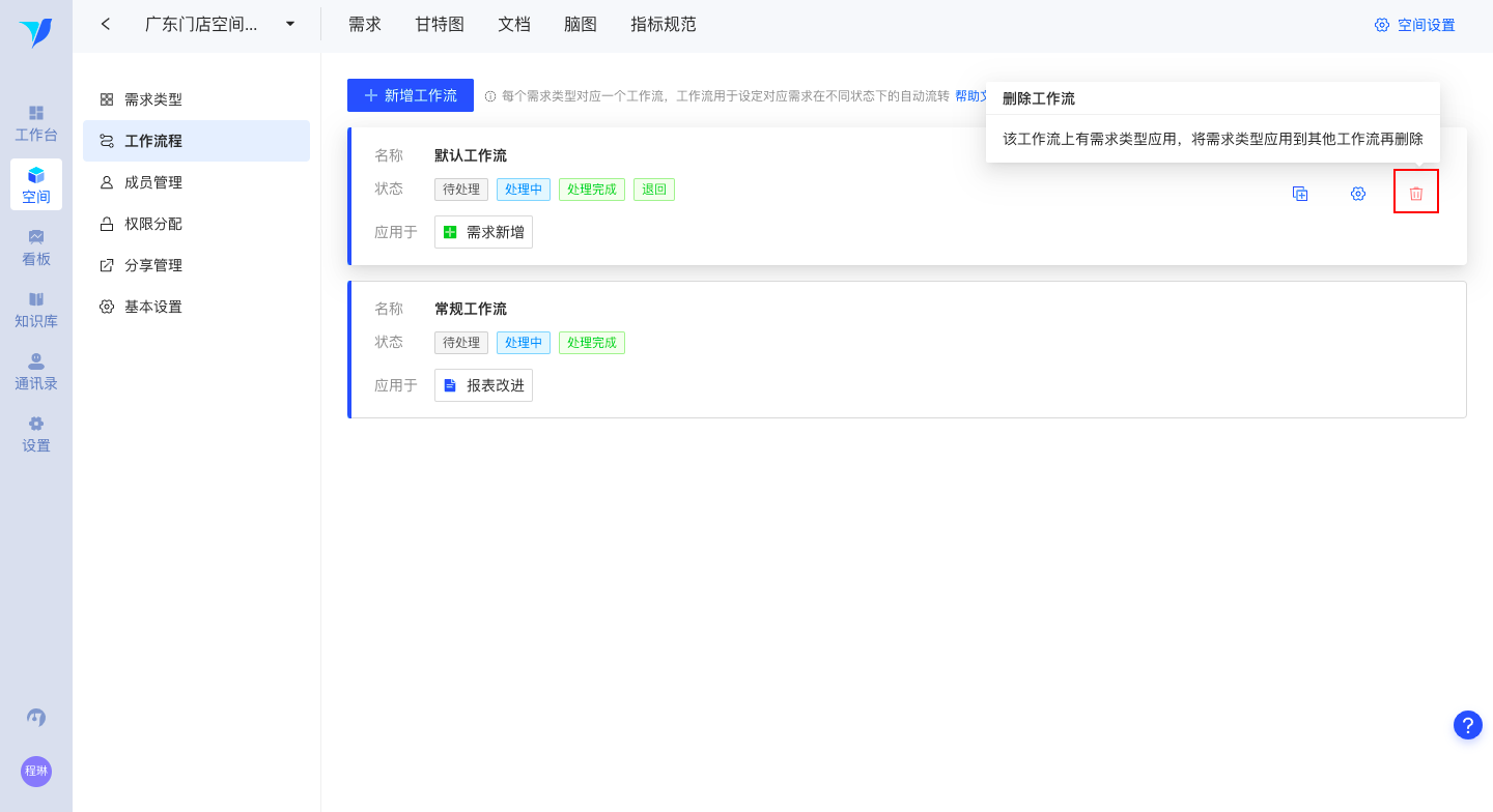 注:若空间中有应用该工作流程的需求,就不可删除,需将这些需求类型应用其他工作流程后才可删除。