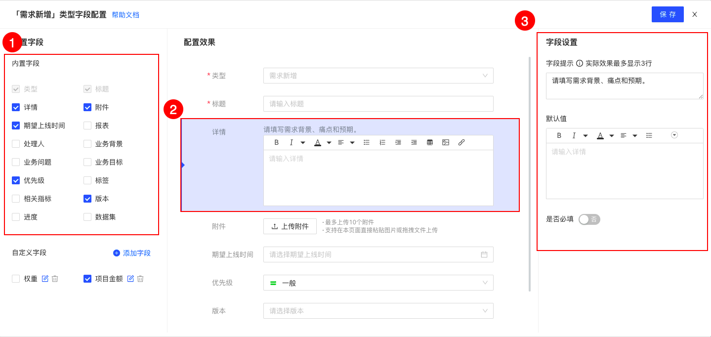 不同的需求类型,可以根据实际情况,编辑需求反馈、需求流转时需要填写的字段。在这里我们可以自定义设置这个需求类型需要哪些字段信息,哪些是必填项,以及详细的书写规范引导。
