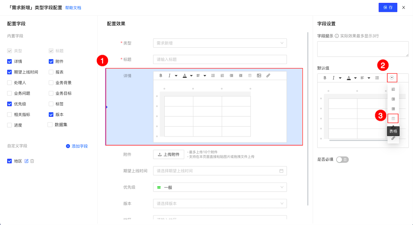 其中需求详情等富文本(多行文本)字段默认值也可以插入表格