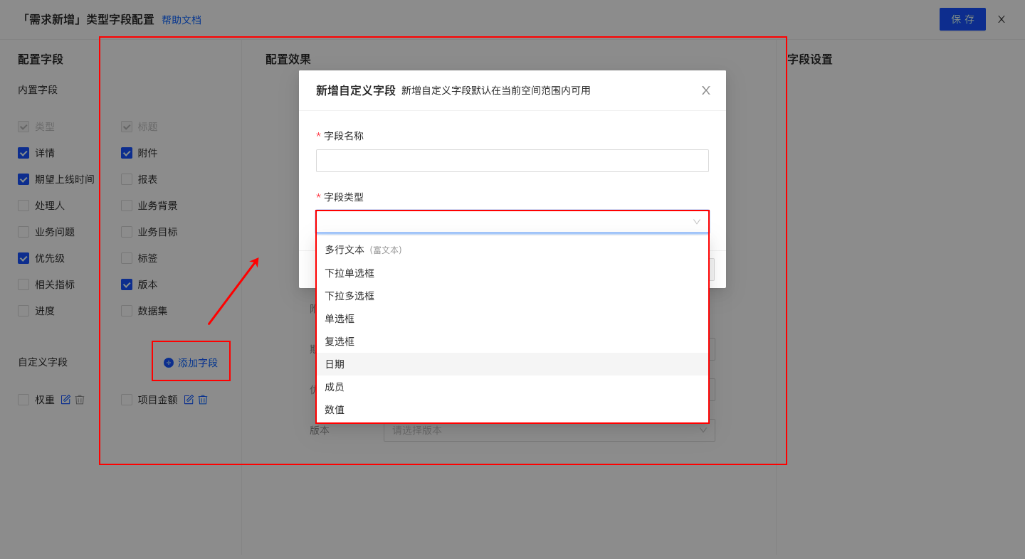 2)自定义字段平台提供包括字段、选框、日期、成员、数值等九种字段类型,可以按需自定义需求反馈字段