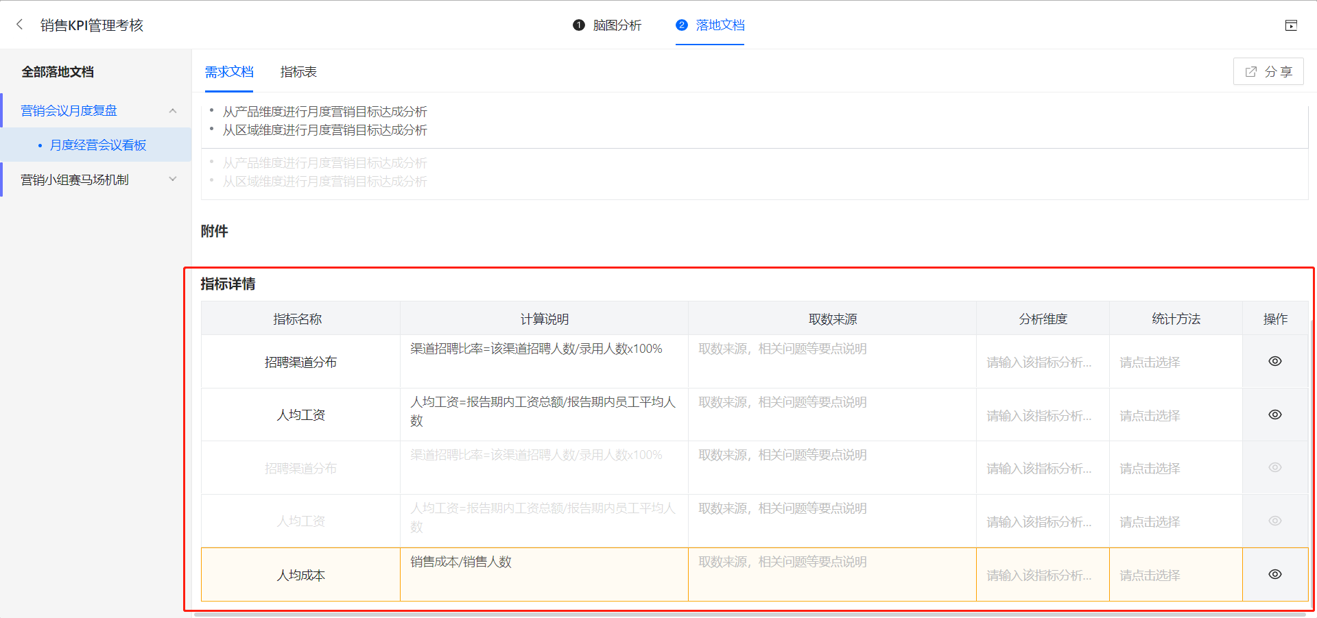 该落地方式用到的所有指标,会汇总在指标表的界面,可以进行再编辑,完善指标内容