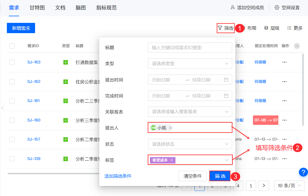 点击【空间】->>【需求】,点击【筛选】,根据实际需要添加筛选条件。(比如我需要查看张华提出的所有业务问题的需求,则添加需求类型条件为“希望成本”,提出人为“小陈”,如下图所示)点击【筛选】。