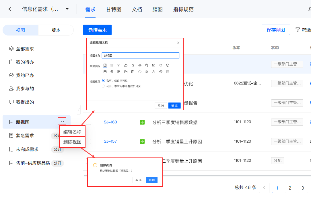 注:仅支持有「创建/编辑/删除公开视图」权限的用户在有权限的空间内进行编辑和删除视图操作。