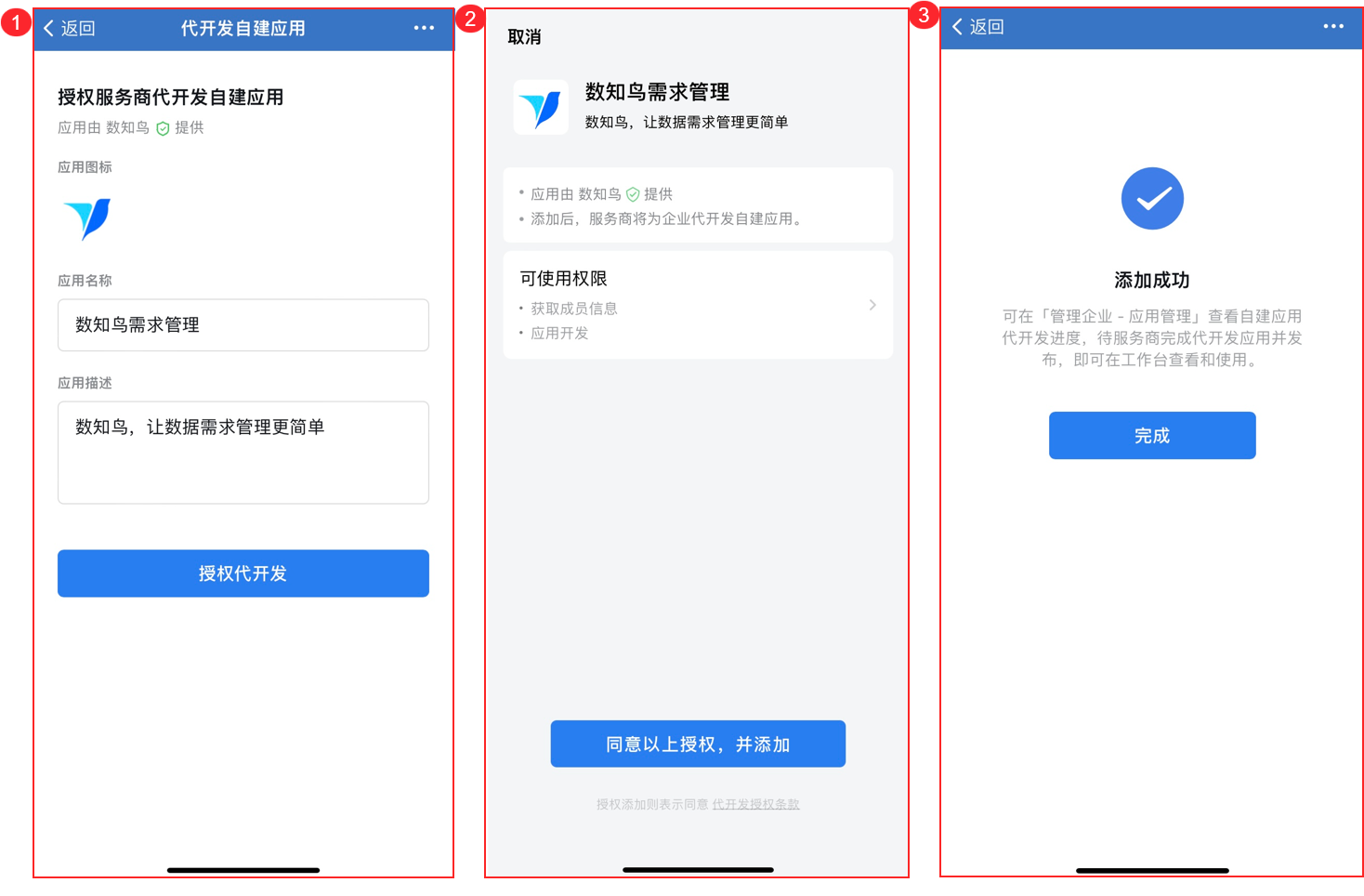 扫描二维码后,企业微信管理员在移动端填写应用详情字段,完成代开发授权