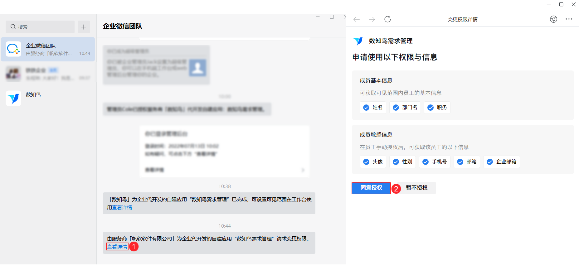 完成授权, 待开发完成后,将会收到变更权限请求,点击【查看详细】-【进行授权】完成信息授权