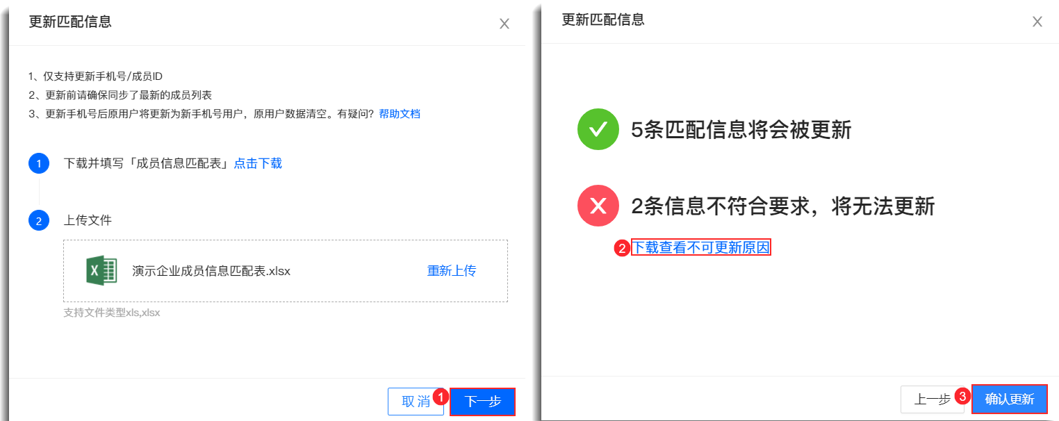 填写完成后,将文件上传,点击【下一步】,在出现的弹窗中会显示将会被更新的匹配信息个数,与不符合要求的信息个数,点击【下载查看不可更新原因】下载「不可更新信息」,点击【确认更新】
