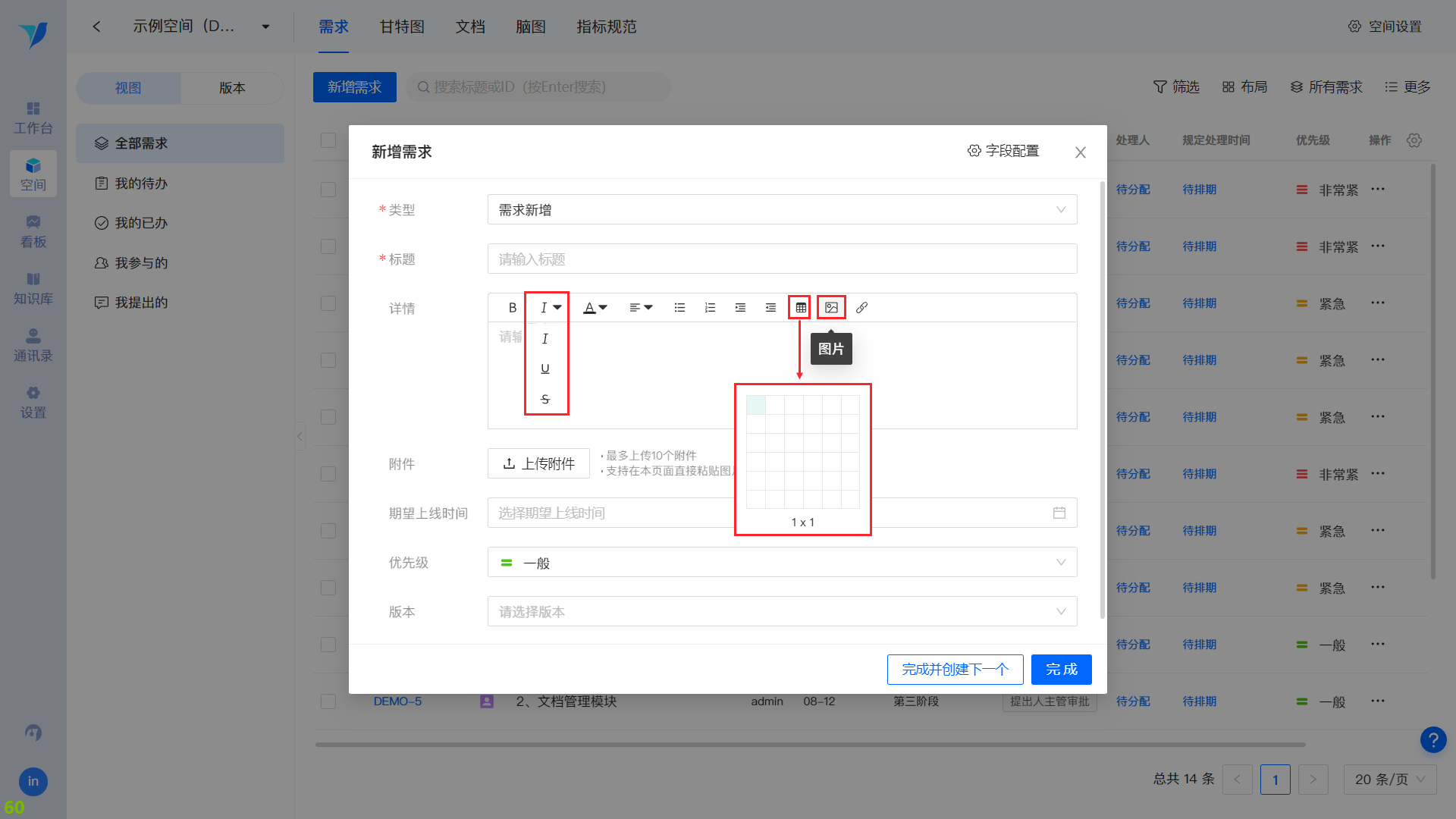 新增需求时可在【详情】、【问题描述】富文本字段即时插入表格、图片