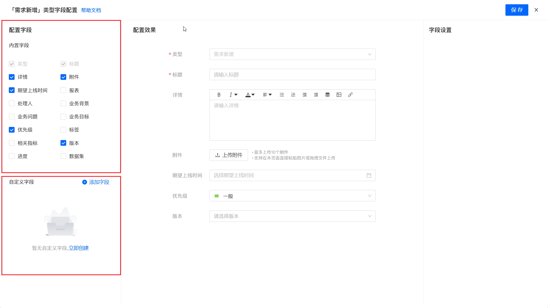注:仅支持有「需求类型」权限的用户在有权限的空间内进行配置需求字段操作。