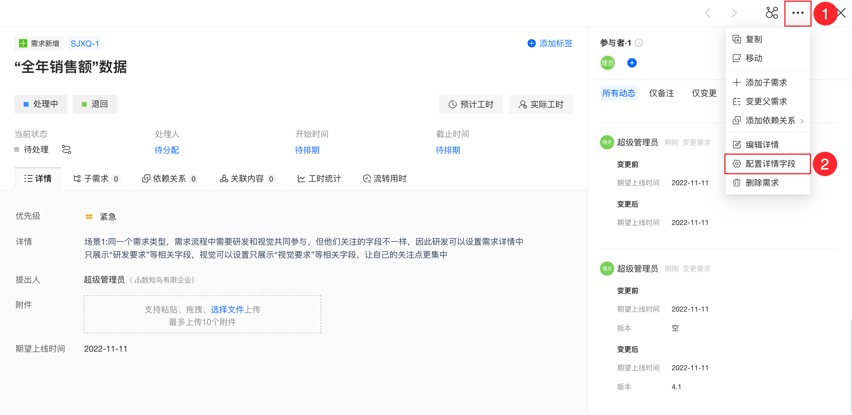 场景1:同一个需求类型,需求流程中需要研发和视觉共同参与,但他们关注的字段不一样,因此研发可以设置需求详情中只展示“研发要求”等相关字段,视觉可以设置只展示“视觉要求”等相关字段,让自己的关注点更集中