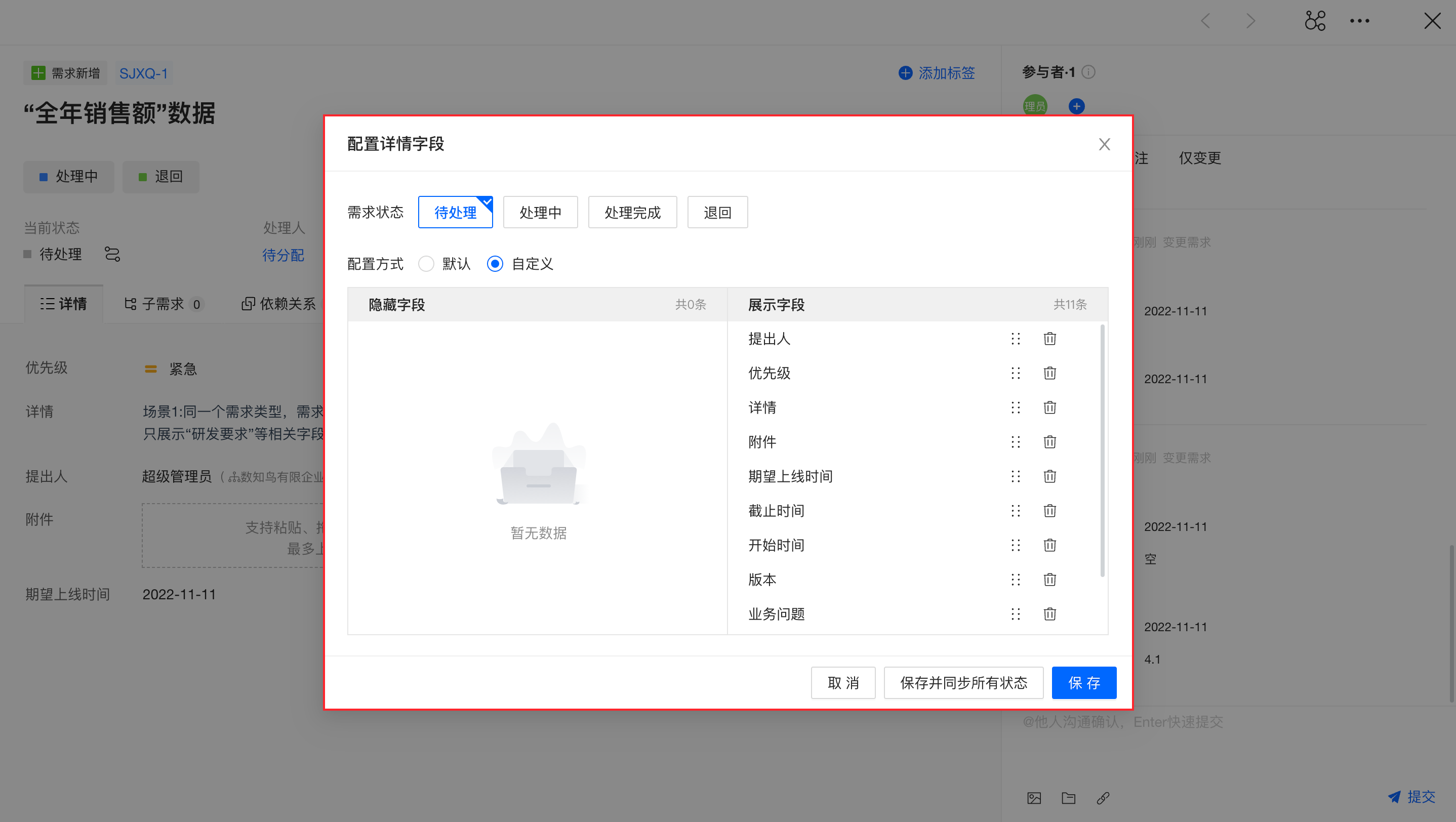场景2:同一个用户,处理不同需求类型A/B的需求时,对不用字段关注度不一样,对于需求类型A更关注“详情”字段,对于需求类型B更关注“优先级”字段,就可以调整这些字段的展示顺序