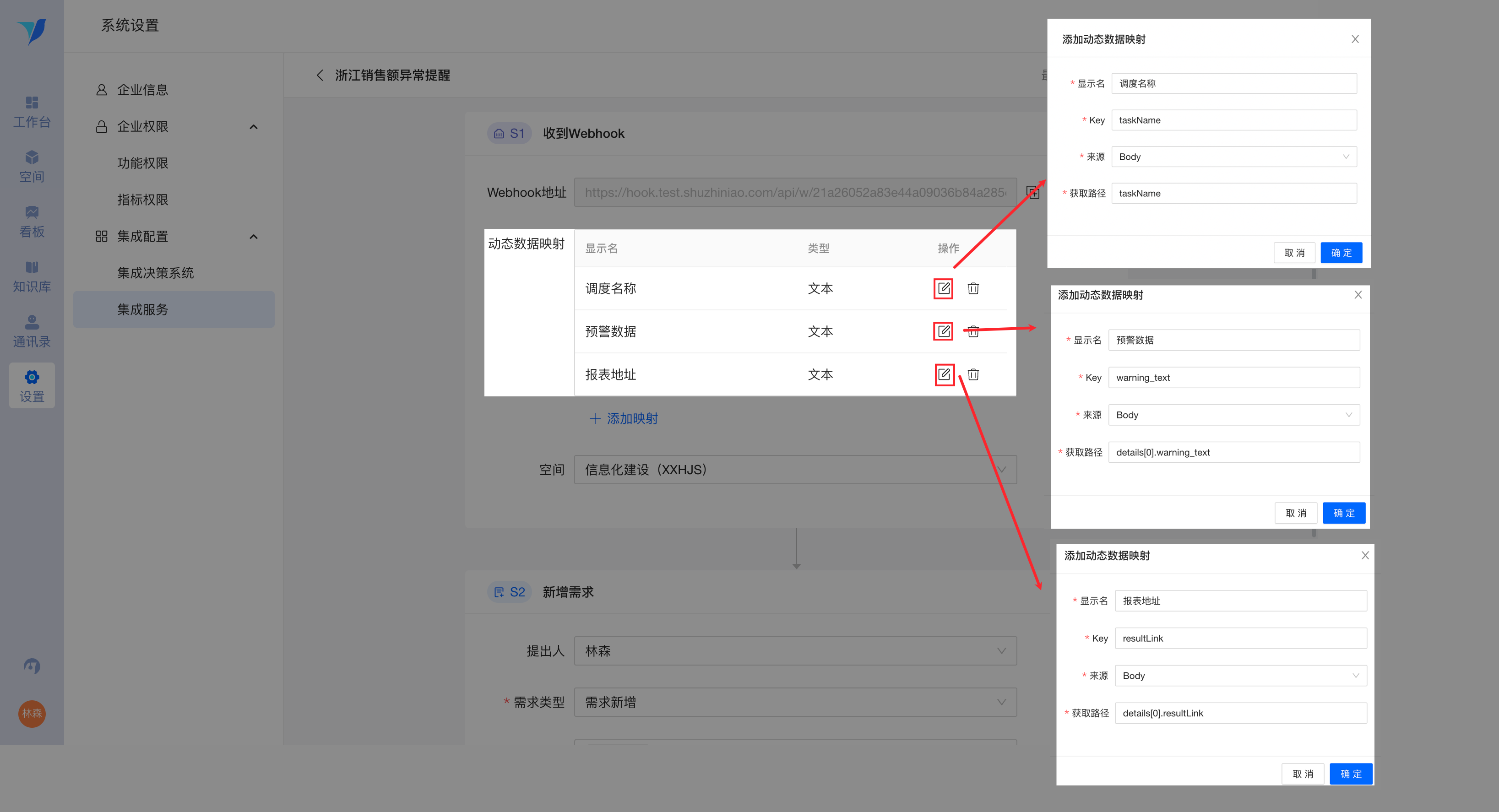 2)在webhook卡片中设置集成服务作用空间