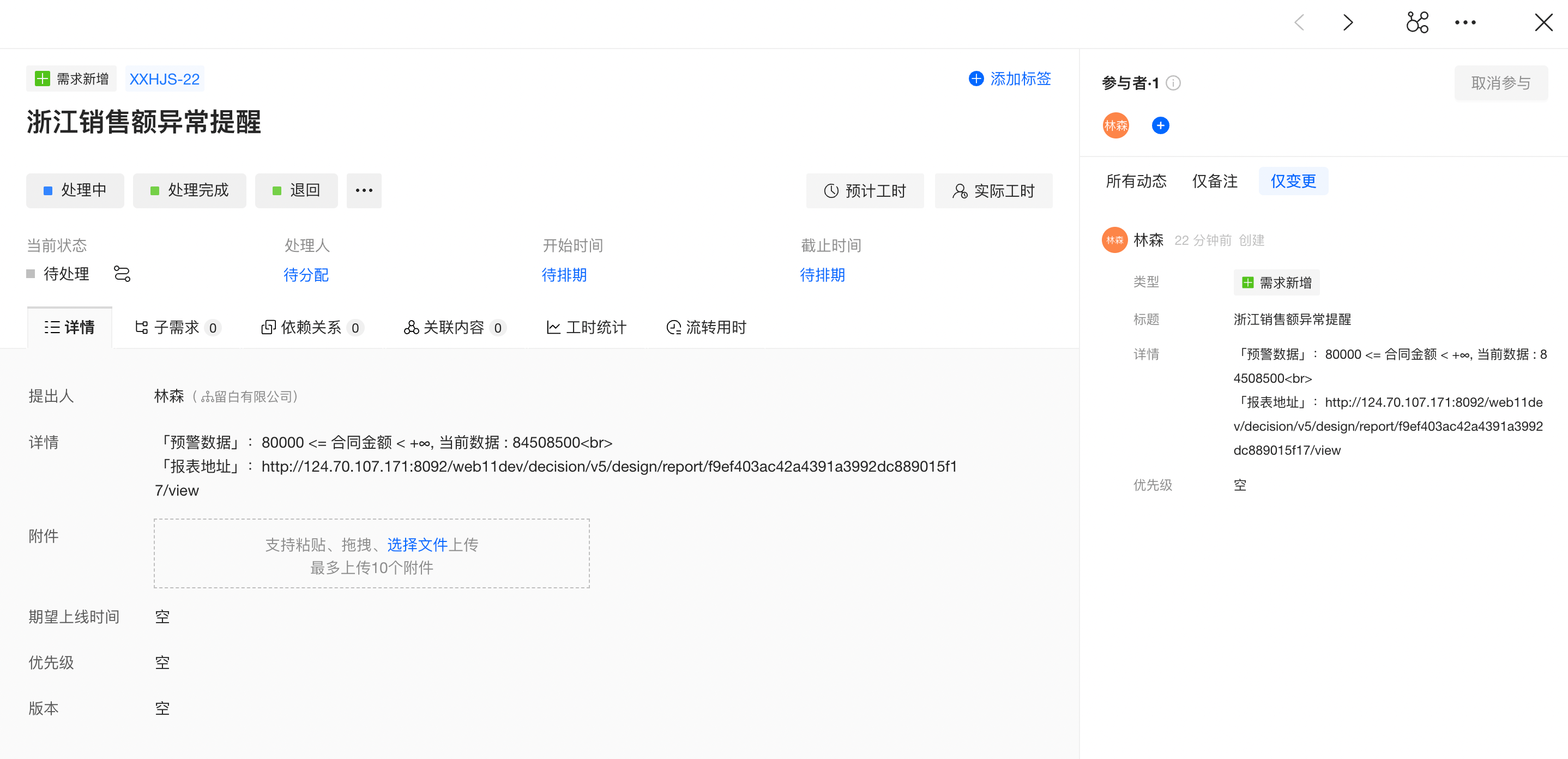 空间内新增需求,需求类型为“需求新增”、标题为“浙江销售额异常提醒”、详情为“预警数据和报表地址”