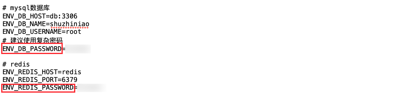 | mysql数据库与redis密码,建议使用复杂密码 | 高,否则有安全风险 | |