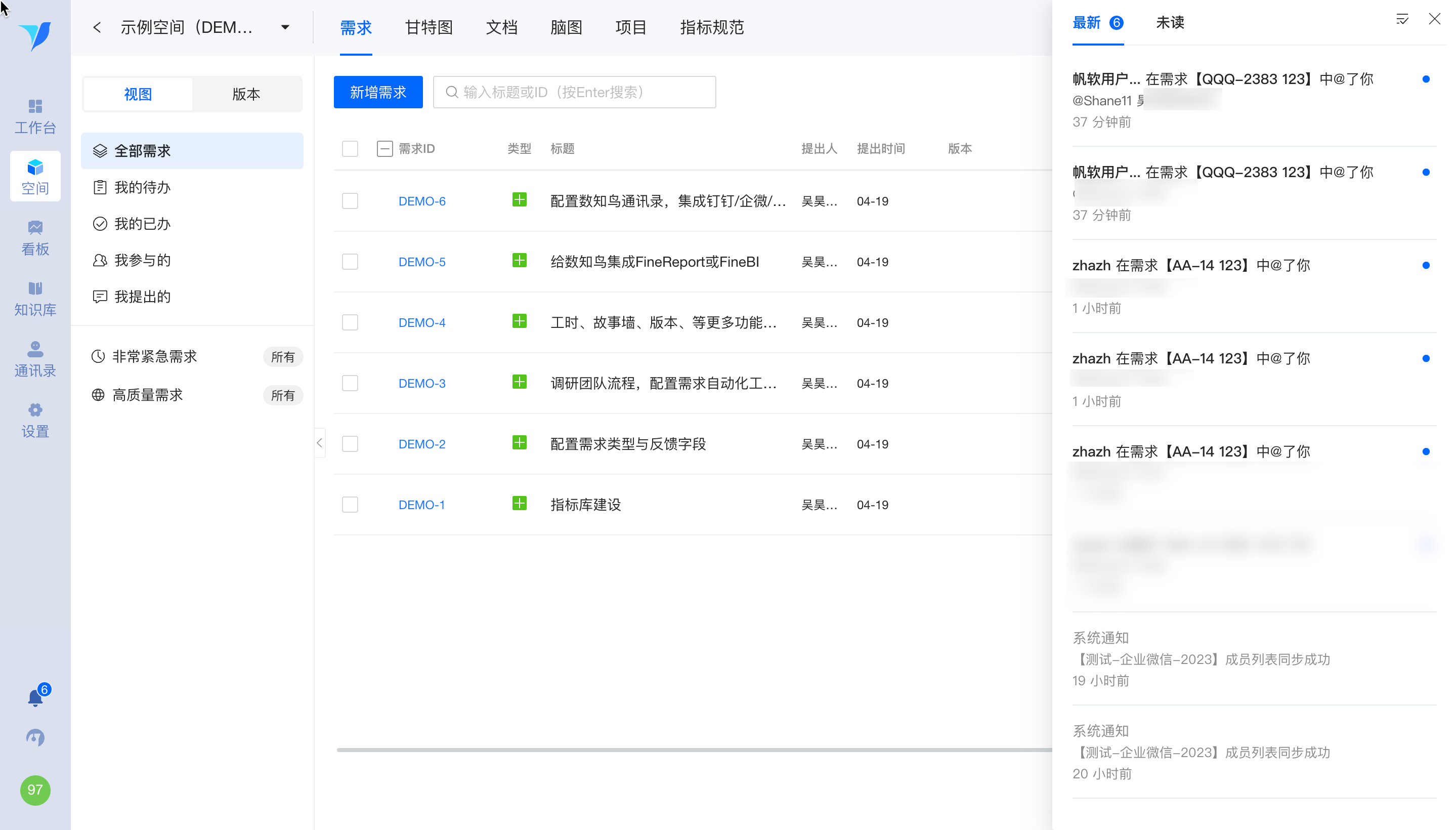 平台内消息通知模块支持推送“系统”、“需求”及“文档”消息,其中需求消息又可区分为待办需求的状态变更、超期需求的提醒、参与需求的状态变更、@我的。
