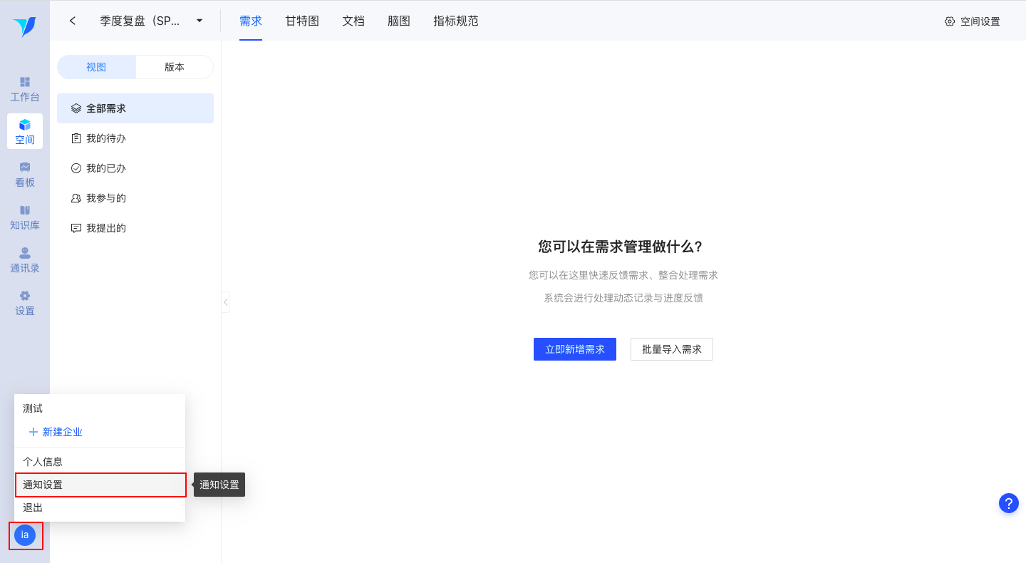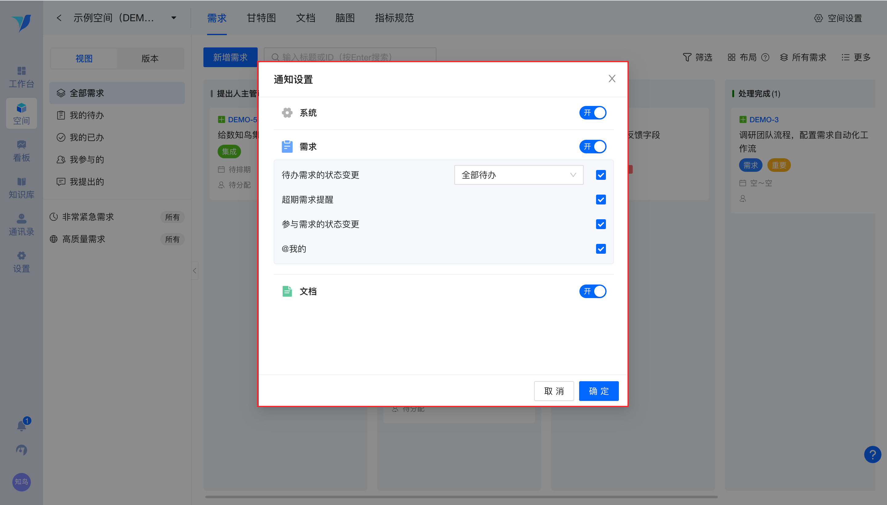 可针对“系统”、“需求”及“文档”消息,这三类通知个性化设置是否推送。其中需求消息又可区分为待办需求的状态变更、超期需求的提醒、参与需求的状态变更、@我的,进行细分选择。